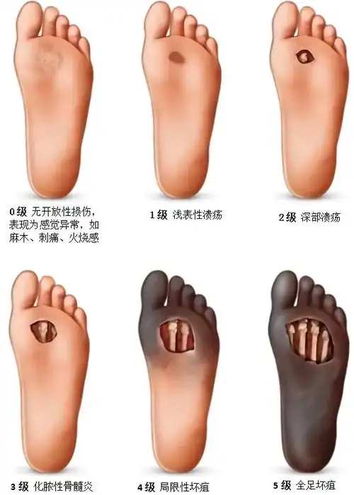 糖尿病足的分级通常采用Wagner分级系统,根据溃疡的深度和感染程度分为6个等级: